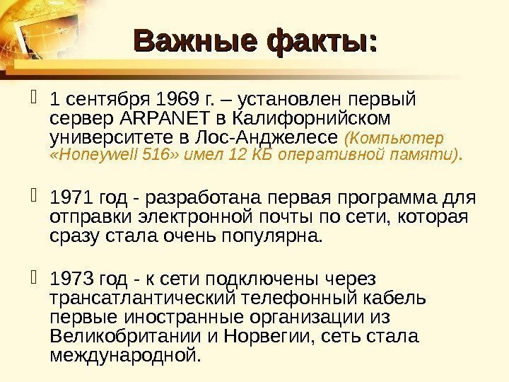 Важные факты: 1 сентября 1969 г. – установлен первый сервер ARPANET в Калифорнийском университете в Лос-Анджелесе (Компьютер «Honeywell 516» имел 12 КБ оперативной памяти). 1971 год — разработана первая программа для отправки электронной почты по сети, которая сразу стала очень популярна. 1973 год — к сети подключены через трансатлантический телефонный кабель первые иностранные организации из Великобритании и Норвегии, сеть стала международной.
