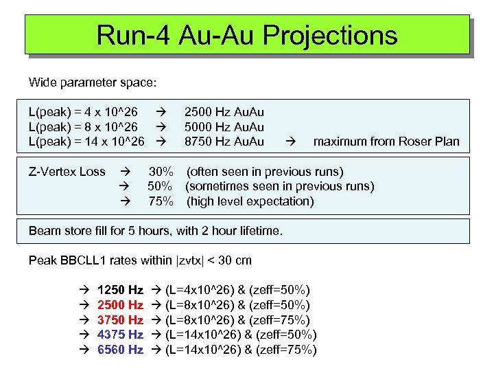 Run-4 Au-Au Projections Wide parameter space: L(peak) = 4 x 10^26 L(peak) = 8 x 10^26 L(peak) = 14 x 10^26 Z-Vertex Loss 2500 Hz Au. Au 5000 Hz Au. Au 8750 Hz Au. Au maximum from Roser Plan 30% (often seen in previous runs) 50% (sometimes seen in previous runs) 75% (high level expectation) Beam store fill for 5 hours, with 2 hour lifetime. Peak BBCLL 1 rates within |zvtx| < 30 cm 1250 Hz 2500 Hz 3750 Hz 4375 Hz 6560 Hz (L=4 x 10^26) & (zeff=50%) (L=8 x 10^26) & (zeff=75%) (L=14 x 10^26) & (zeff=50%) (L=14 x 10^26) & (zeff=75%)