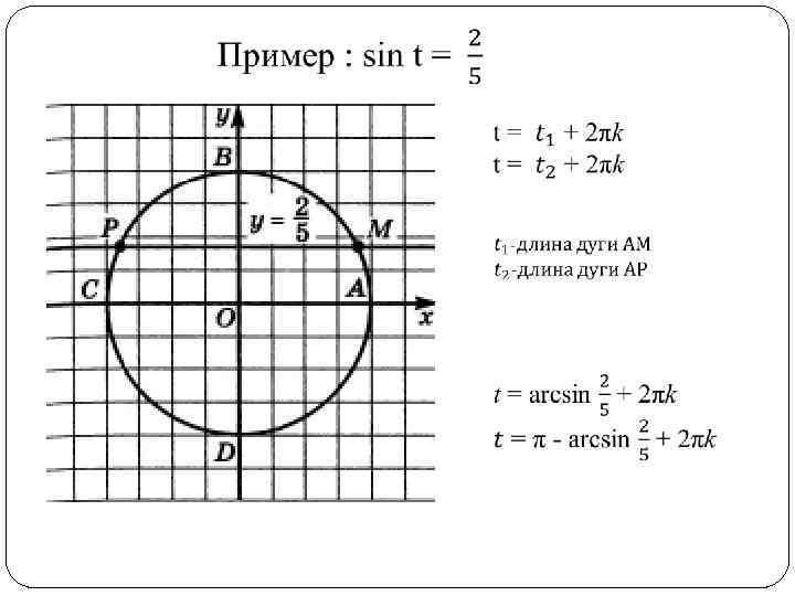 Если |a|>1 , то уравнение вида sin t = a не имеет корней. Если |a|≤ 1, уравнение sin t = a имеет решения вида: Частные случаи : 1. sinx=0 ⇒ x=πk , k∈Z 2. sinx=1 ⇒ x =π2+2πk , k∈Z 3. sinx=− 1 ⇒ x =−π2+2πk , k∈Z