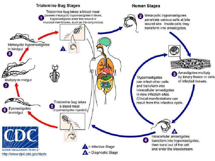 Патогенное действие Основные проявления болезни : • лихорадка • недомогание • увеличение лимфоузлов • ахалазия кардии (нарушение способности к расслаблению гладкой мышечной ткани) • увеличение размеров пищевода • кардиомиопатия Острая стадия заболевания проявляется лихорадкой и нарушением общего состояния. У большинства нелеченных больных инфекция переходит в латентную стадию, которая длится всю жизнь, а иногда развивается хроническая стадия болезни Чагаса (тяжелое поражение сердца и ЖКТ со смертельным исходом). Диагностика • мазок крови или спинномозговой жидкости • серологические исследования • кожные пробы • заражение лабораторных животных
