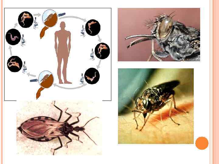 ТРИПАНОСОМЫ- ПАРАЗИТЫ Паразитируют на различных хозяевах и вызывают многие заболевания, среди которых сонная болезнь и болезнь Шагаса (Чагаса). Естественным резервуаром трипаносом в основном являются млекопитающие, переносчиком- насекомые. Инвазионной стадией для человека является-вегетативная (жгутиковая) форма. Путь инвазии- перкутанный. Способ заражения- трансмиссивный. Переносчик- муха цеце и триатомовые клопы.