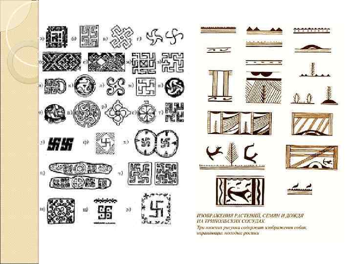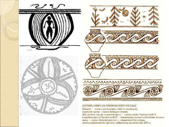 Над верхней линией узкой полосы, обозначающей почву, на трипольской керамике нередко изображаются растения, в которых трудно угадать, что это - деревца или колосья. Растения рисуются иногда на сегментовидном возвышении. Очень часто над растением сверху от линии неба нависает черный полукруг или сегмент, от которого иногда идут вниз, к земле, частые косые линии, напоминающие дождь.