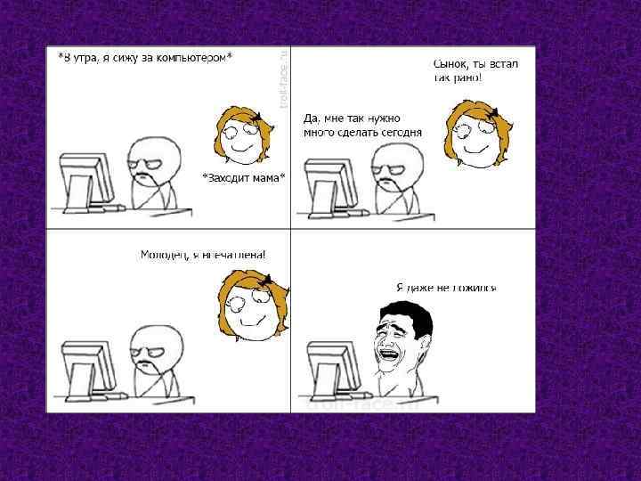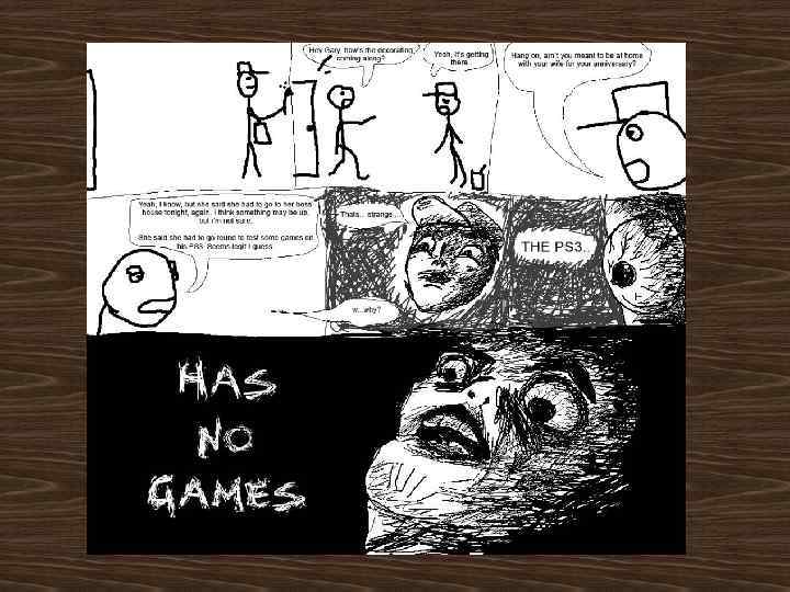 Oh Crap / OMG Rage Face • Oh Crap / OMG Rage Face – комиксы, в финальной сцене которых крупным планом изображается лицо человека, испытывающего удивление, неожиданность или бешенство. Рядом обычно размещается текст, описывающий эмоции персонажа. • В нем один из персонажей говорит, что его жена не сможет отметить их юбилей, так как она должна проверить игры для PS 3 вместе с ее начальником. Другой персонаж сомневается в этом, зловеще говоря, что на PS 3 нет игр.