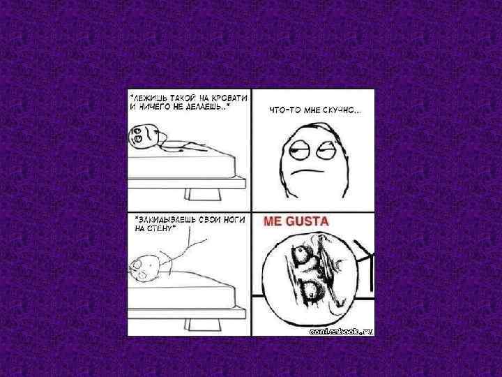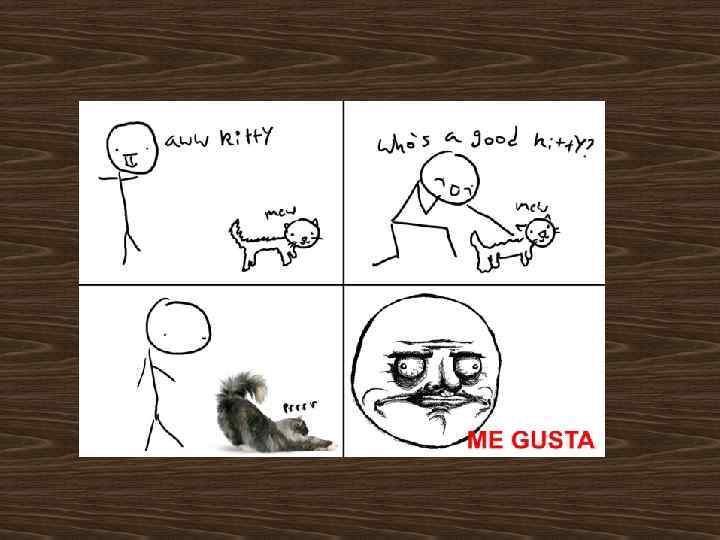Me Gusta • Me Gusta – в переводе с испанского «Мне нравится» . В комиксах показано лицо человека, сделавшего что либо противное и отвратительное и испытывающего от этого удовльствие. Первый комикс был размещен на сайте reddit 18 марта 2010 года. Автор Me Gusta – Insert 31990 с сайта. Deviant. Art
