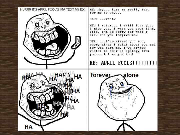 Forever Alone (Навеки один) • Forever Alone - герой комиксов, обычно использующийся для обозначения одиночества и разочарования жизнью. • Первый комикс c ним появился на сайте Funny. Junk 27 июня 2010 года. В нем главный герой звонит своей бывшей девушке, которую он бросил, извиняется перед ней, выслушивает ее признание в любви, затем поздравляет ее с первым апреля, заливается сначала смехом, а потом слезами.
