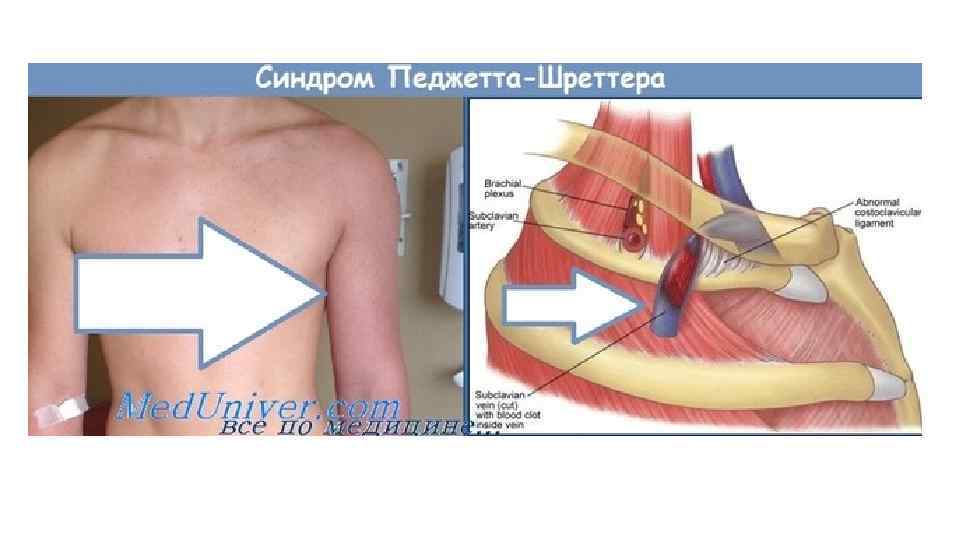 • Тромбоз подключичной вены может быть первичным и вторичным. Первичный известен под названием болезни, или синдрома, Педжета Шреттера Кристелли, травматического тромбоза или тромбоза усилия.