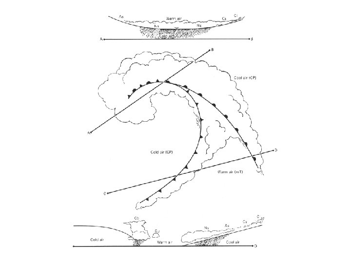 Kolm õhuvoolu tsüklonis (konveieririhmad) • Soe õhuvool - saab alguse maapinna lähedalt soojast sektorist külma frondi eest. Õhk liigub lõunast põhja poole tõustes mööda sooja frondi pinda. Tekivad pilved. Kõrgemates õhukihtides pöördub see paremale, s. o. ida suunas