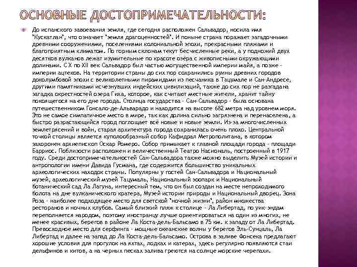 До испанского завоевания земля, где сегодня расположен Сальвадор, носила имя "Кускатлан", что означает "земля драгоценностей". И поныне страна поражает загадочными древними сооружениями, поселениями колониальной эпохи, прекрасными пляжами и благоприятным климатом. По горным склонам текут бесчисленные реки, а у подножий двух десятков вулканов лежат изумительные по красоте озёра с живописными окружающими долинами. С Х по XII век Сальвадор был частью могущественной империи майя, а позже империи ацтеков. На территории страны до сих пор сохранились руины древних городов доколумбовой эпохи с великолепными пирамидами из песчаника в Taцумале и Сан-Андресе, другими памятниками исчезнувших индейских цивилизаций, также до сих пор не разгадана загадка окрестностей озера Гиха, которое, как считают местные жители, хранит тайну покоящегося на его дне города. Столица государства - Сан-Сальвадор - была основана путешественником Гонсало-де-Альварадо и находится на высоте 682 метра над уровнем моря. Это не самое симпатичное место в мире, так как долина сильно загрязнена и перенаселена, а быстро разрастающийся город поглощает всё новые и новые земли. Из-за многочисленных землетрясений и войн, старая архитектура города сохранилась очень плохо. Центральной точкой столицы является куполообразный собор Кафидрал Метрополитана, в котором захоронен архиепископ Оскар Ромеро. Собор примыкает к главной площади города - площади Барриос. Поблизости расположен и величественный Театро Насиональ, построенный в 1917 году. Среди достопримечательностей Сан-Сальвадора также можно выделить Музей истории и антропологии имени Давида Гусмана, где содержится большинство уникальных археологических находок страны. Популярны у гостей Сан-Сальвадора и Национальный музей, археологический музей Тацумаль, Национальный зоопарк и Национальный ботанический сад Ла Лагуна, интересный тем, что он был создан на месте непроходимого болота на дне вулканического кратера, Музей истории природы и Национальный дворец. Зона Роза - наиболее подходящее место для светской "ночной жизни", район множества ресторанов и ночных клубов. Самый близкий пляж к столице - Ла Либертад, по уик-эндам переполняется народом, поэтому иностранцу лучше ориентироваться на один из многих, не менее красивых, берегов в районе Ла Коста-дель-Бальсамо в 75 км. к западу от Ла Либертад. Превосходное место для серфинга - мощные океанские волны у берегов Эль-Сунцаль, Ла Либертад и далее на запад до Ла Коста-дель-Бальсамо. Острова в заливе Фонсека предлагают хорошие условия для прогулок на яхтах, лодках и катерах, здесь регулярно появляются стаи дельфинов и китов, а на черных песках залива греются на солнце морские черепахи.