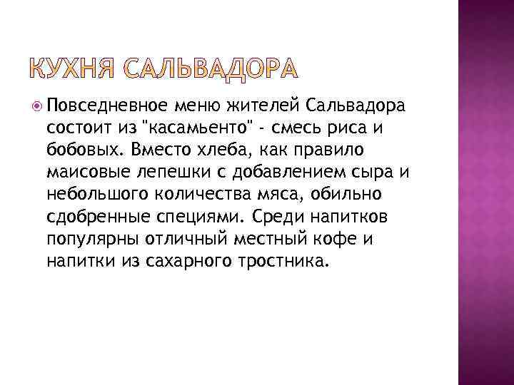 Повседневное меню жителей Сальвадора состоит из "касамьенто" - смесь риса и бобовых. Вместо хлеба, как правило маисовые лепешки с добавлением сыра и небольшого количества мяса, обильно сдобренные специями. Среди напитков популярны отличный местный кофе и напитки из сахарного тростника.