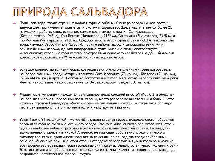 Почти всю территорию страны занимают горные районы. С северо-запада на юго-восток тянутся две протяженные горные цепи системы Кордильер. Здесь насчитывается более 25 потухших и действующих вулканов, самые крупные из которых - Сан-Сальвадор (Кетцальтепек, 1943 м), Сан-Висент (Чичонтепек, 2182 м), Санта-Ана (Льяматепек, 2365 м) и Сан-Мигель (Чаппарастик, 2130 м). Средняя высота территории страны - 600 м, высочайшая точка - вулкан Серро-Питаль (2730 м). Горные районы заросли широколиственными и вечнозелеными лесами, однако плодородные вулканические почвы способствуют интенсивному освоению горных склонов отраслями сельского хозяйства (на данный момент здесь сохранилось лишь 24% некогда обширных горных лесов). Большое количество вулканических кратеров занято многочисленными горными озерами, наиболее важными среди которых являются Лаго-Илопанго (70 кв. км), Коатепек (26 кв. км), Гуиха (44 кв. км) и другие. Несколько искусственных озер были созданы запруживанием реки Лемпа, наибольшим из которых является Эмбэлс-Сиррон-Гранде (350 кв. км). Между горными цепями находится центральное плато средней высотой 610 м. Эта область наибольшая и самая населенная часть страны, место расположения столицы и большинства крупных городов Сальвадора. Многочисленные плантации и пастбища покрывают большую часть центрального плато и прилегающих к нему долин и равнин. Узкая (всего 24 км шириной - менее 6% площади страны) полоса тихоокеанского побережья обрамляет горные районы с юга и юго-запада. Это зона интенсивного сельского хозяйства и одна из наиболее неблагоприятных в экологическом плане областей страны. Сальвадор единственная страна в Латинской Америке, не имеющая собственного экологического законодательства и практически полностью изменившая природную среду прибрежных районов. Многие из речных систем страны страдают от загрязнения, а некогда занимавшие все побережье леса практически полностью уничтожены. Однако устья многочисленных рек и болотистые лагуны побережья являются одним из немногих мест на территории страны, где сохранилась естественная флора и фауна.