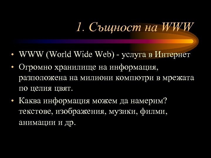 1. Същност на WWW • WWW (World Wide Web) - услуга в Интернет • Огромно хранилище на информация, разположена на милиони компютри в мрежата по целия цвят. • Каква информация можем да намерим? текстове, изображения, музики, филми, анимации и др.