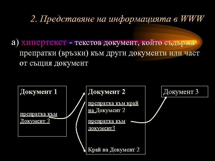 2. Представяне на информацията в WWW а) хипертекст - текстов документ, който съдържа препратки (връзки) към други документи или част от същия документ Документ 1 препратка към Документ 2 препратка към край на Документ 2 препратка към документ3 Край на Документ 2 Документ 3