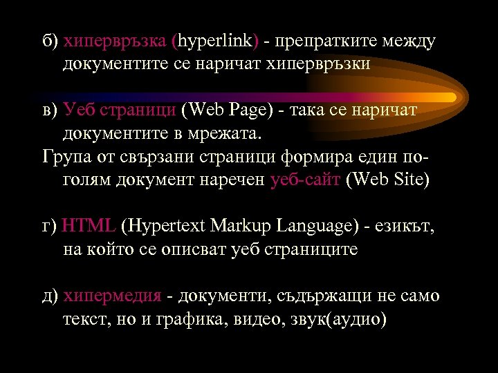 б) хипервръзка (hyperlink) - препратките между документите се наричат хипервръзки в) Уеб страници (Web Page) - така се наричат документите в мрежата. Група от свързани страници формира един поголям документ наречен уеб-сайт (Web Site) г) HTML (Hypertext Markup Language) - езикът, на който се описват уеб страниците д) хипермедия - документи, съдържащи не само текст, но и графика, видео, звук(аудио)