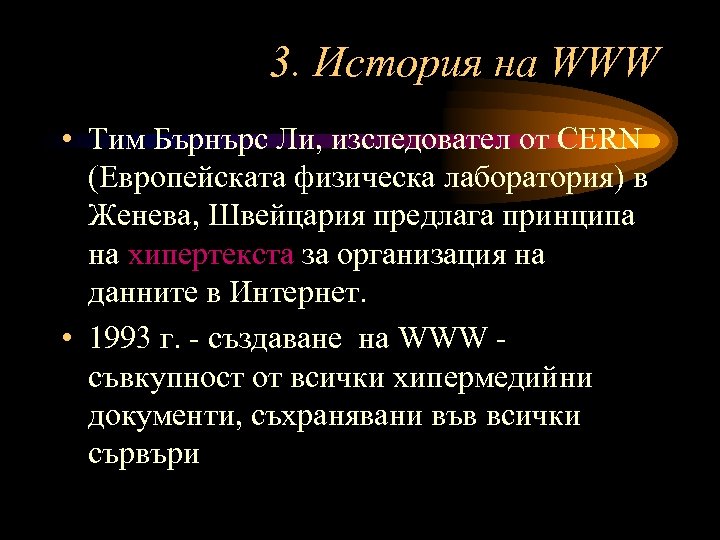 3. История на WWW • Тим Бърнърс Ли, изследовател от CERN (Европейската физическа лаборатория) в Женева, Швейцария предлага принципа на хипертекста за организация на данните в Интернет. • 1993 г. - създаване на WWW съвкупност от всички хипермедийни документи, съхранявани във всички сървъри