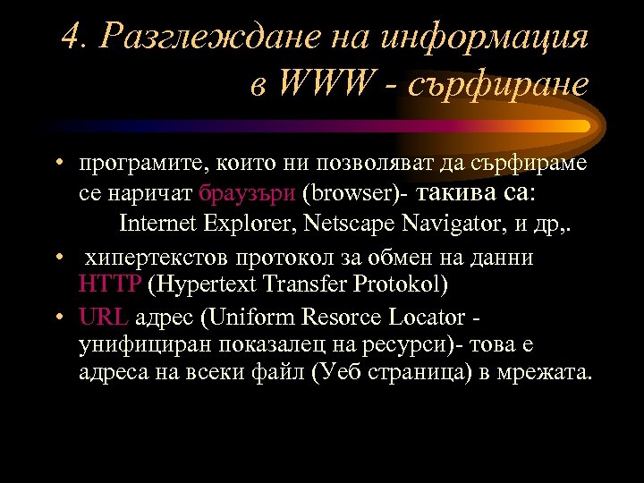 4. Разглеждане на информация в WWW - сърфиране • програмите, които ни позволяват да сърфираме се наричат браузъри (browser)- такива са: Internet Explorer, Netscape Navigator, и др, . • хипертекстов протокол за обмен на данни HTTP (Hypertext Transfer Protokol) • URL адрес (Uniform Resorce Locator унифициран показалец на ресурси)- това е адреса на всеки файл (Уеб страница) в мрежата.