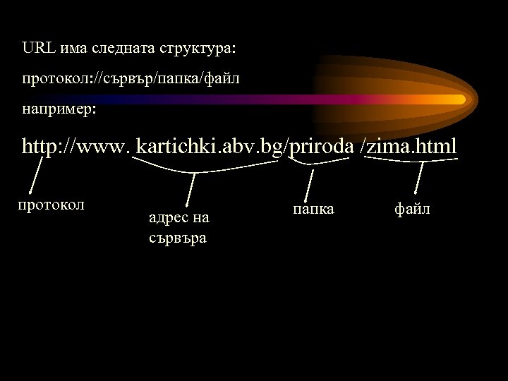URL има следната структура: протокол: //сървър/папка/файл например: http: //www. kartichki. abv. bg/priroda /zima. html протокол адрес на сървъра папка файл