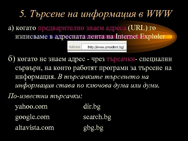 5. Търсене на информация в WWW а) когато предварително знаем адреса (URL) го изписваме в адресната лента на Internet Exploler б) когато не знаем адрес - чрез търсачки- специални сървъри, на които работят програми за търсене на информация. В търсачките търсенето на информация става по ключова дума или думи. По-известни търсачки: yahoo. com dir. bg google. com search. bg altavista. com gbg. bg