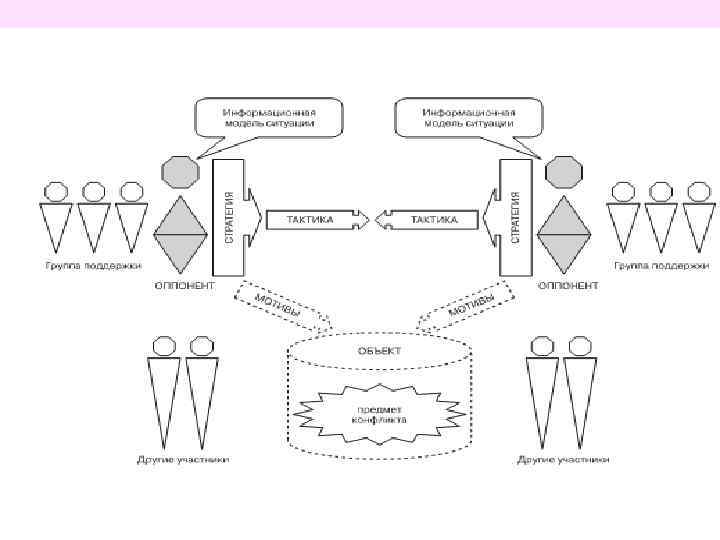 Структура конфликта Группы поддержки. Практически всегда в любом конфликте за оппонентами стоят силы, которые могут быть представлены отдельными индивидами, группами и т. д. Другие участники. В данную группу входят субъекты, которые оказывают эпизодическое влияние на ход и результаты конфликта (подстрекатель, организатор и др. ).