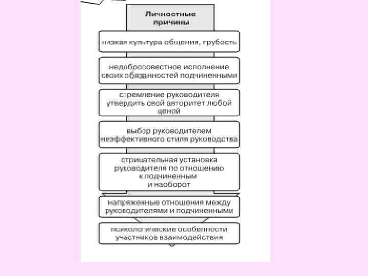 Конфликты в диаде руководитель-подчиненный К объективным причинам таких конфликтов относят следующие. 6. Разбалансированность рабочего места. 7. Рассогласованность связей между рабочими местами в организации. 8. Сложность социальной и профессиональной адаптации руководителя к должности управленца. 9. Недостаточная обеспеченность по объективным условиям управленческих решений всем необходимым для их реализации.