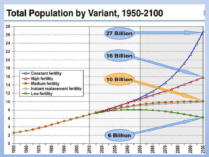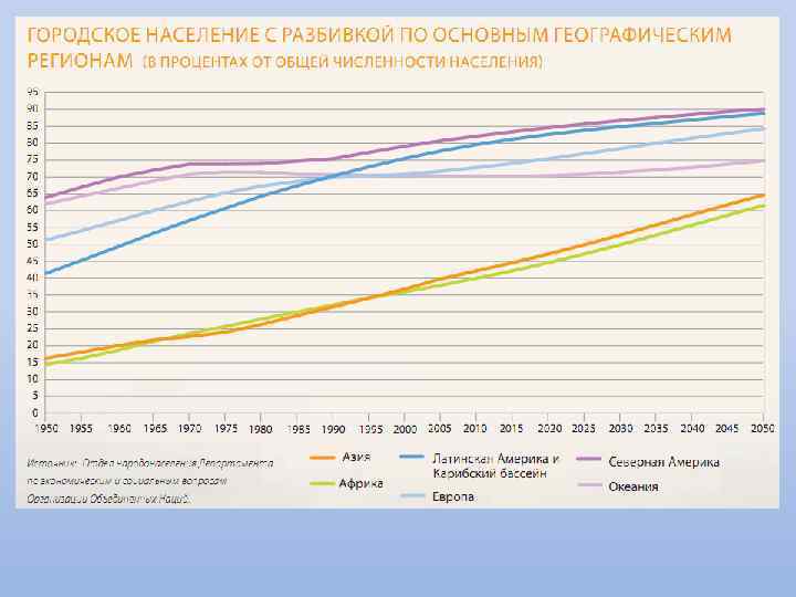 v По прогнозам ООН к 2050 году численность населения мира составит 9, 3 млрд. человек, а к концу этого века превысит 10 млрд. человек, причем в этом сценарии заложено предполагаемое снижение со временем уровня фертильности v Люди моложе 25 лет уже сейчас составляют 43% населения мира, а в некоторых странах их доля достигает 60% v Сегодня в мире проживает 893 млн. человек старше 60 лет v К середине нынешнего века это число вырастет до 2, 4 млрд. человек v «По миру в целом доля населения пожилого возраста увеличивается на 2, 6 процента в год, т. е. значительно быстрее, чем население в целом… Такой быстрый рост потребует от большинства стран кардинального изменения социально экономической базы» v Каждый 2 й проживает в городах, а всего через 35 40 лет в городах будет проживать 2/3 населения