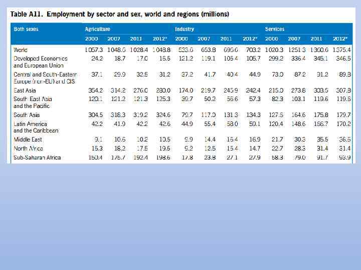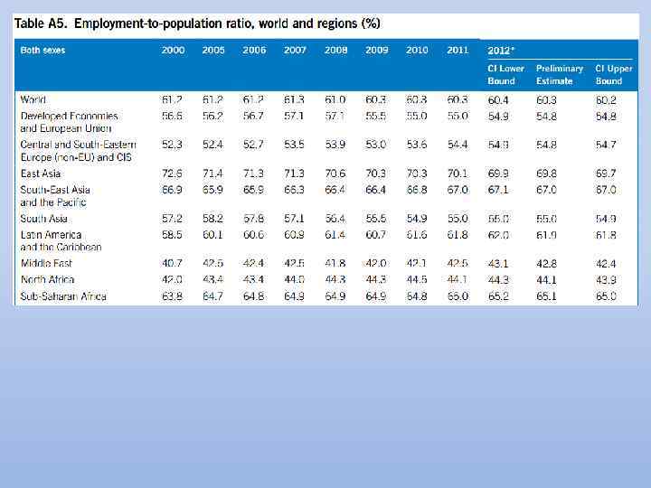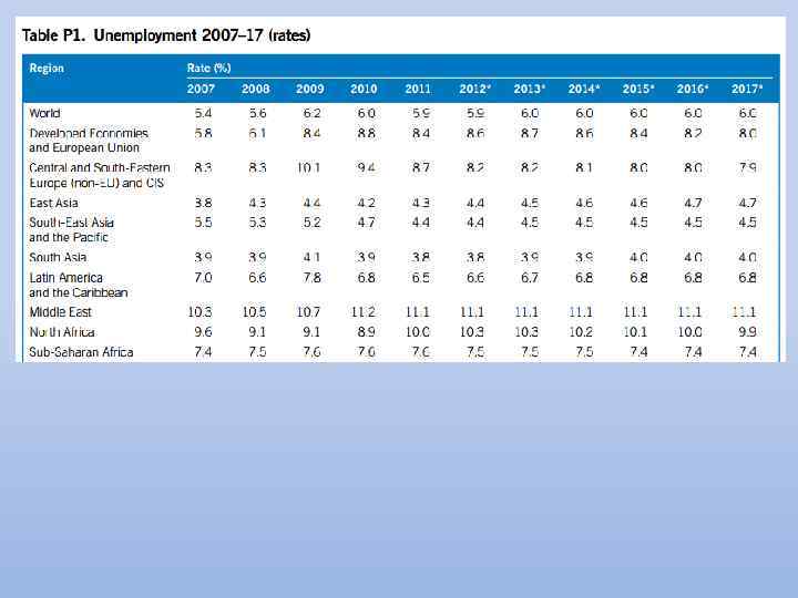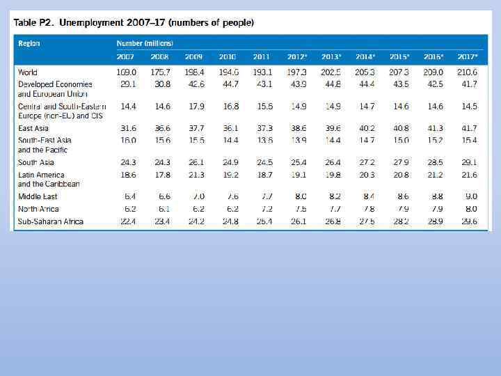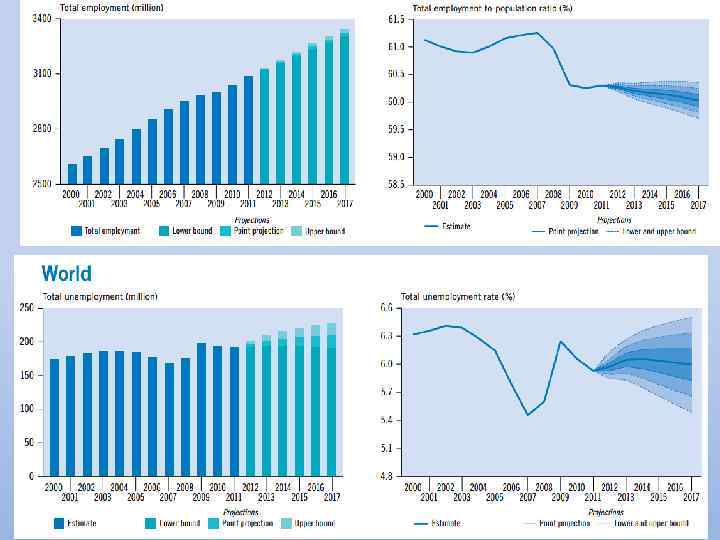 Глобальные тренды занятости (www. ilo. org – Международная организация труда) § § § Экономически активное население лица в возрасте, установленном для измерения экономической активности населения, которые в рассматриваемый период (обследуемую неделю) считаются занятыми или безработными. Экономически неактивное население лица в возрасте, установленном для измерения экономической активности населения, которые не считаются занятыми экономической деятельностью или безработными в течение рассматриваемого периода (обследуемой недели). Уровень экономической активности населения отношение численности экономически активного населения определенной возрастной группы к общей численности населения соответствующей возрастной группы, в процентах. Уровень занятости отношение численности занятого населения определенной возрастной группы к общей численности населения соответствующей возрастной группы, в процентах. Уровень безработицы отношение численности безработных определенной возрастной группы к численности экономически активного населения соответствующей возрастной группы, в процентах. Трудоспособным считается возраст: для мужчин 16 59 лет, женщин 16 54 года.