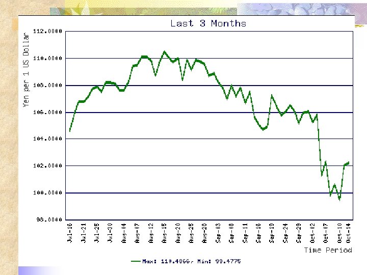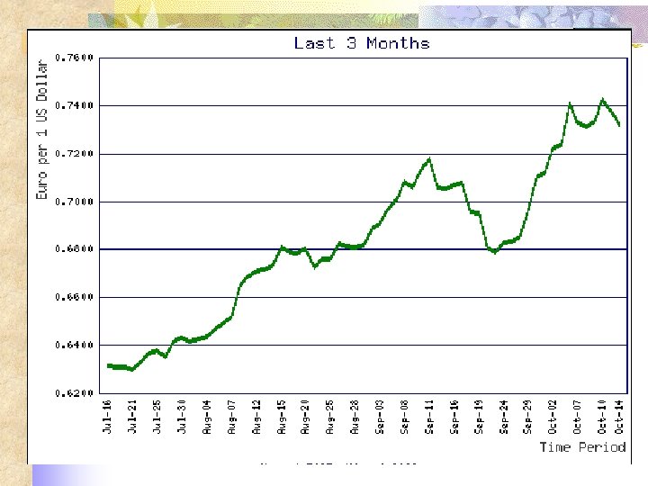 c. Một số nhân tố khác như : Sư điều chỉnh các chính sách tài chính tiền tệ, các sự kiện kinh tế, xã hội, chiến tranh, thiên tai, sự biến động của các chỉ số thống kê về việc làm- thất nghiệp- tăng trưởng kinh tế. Đặc biệt là các chỉ số và các sự kiện tại Mỹ sẽ ảnh hưởng đến tỷ giá hối đoái trên thị trường thế giới. Cụ thể là các nhân tố : n Lãi suất. n Việc làm. n Sự kiện chính trị. Tóm lại : Khi tỷ giá được thả nổi thì nó rất nhạy cảm với những sự kiện kinh tế, chính trị, xã hội, chiến tranh kể cả các yếu tố tâm lí…(11/09)