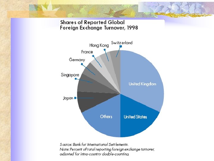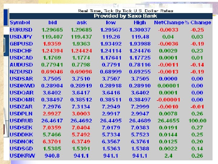 n n Tỷ giá thị trường được xác định trên cơ sở cung và cầu ngoại tệ trên thị trường. Những đồng tiền mạnh như USD, EUR, JPY, CHF, GBP, AUD… giữ vị trí quan trọng của thị trường, đặc biệt là đồng Đôla Mỹ (USD). Theo nghiên cứu 1998, USD được ước tính chiếm 87% giao dịch của thị trường (chiếm khoảng 1300 tỷ USD. ) – Đầu tư, dự trữ, thanh toán, điều chỉnh tỷ giá hối đoái, là đồng tiền trung gian khi kinh doanh các ngoại tệ khác…