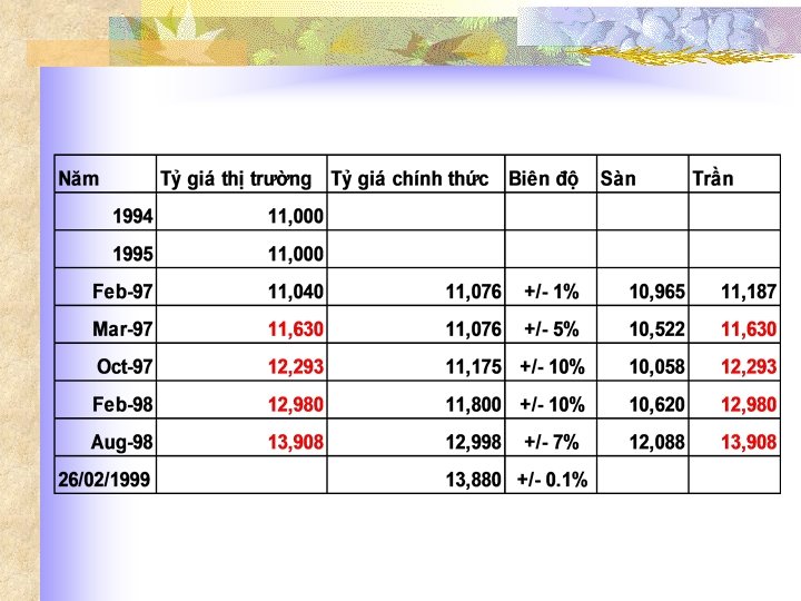 Việt Nam áp dụng chế độ tỷ giá thả nổi có quản lý. Từ ngày 25/02/1999 NHNN công bố tỷ giá bình quân trên thị trường ngoại tệ liên ngân hàng, các NHTM mua bán trong phạm vi 0. 1%, hiện nay + 2%.
