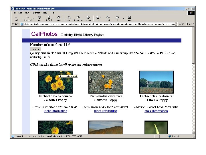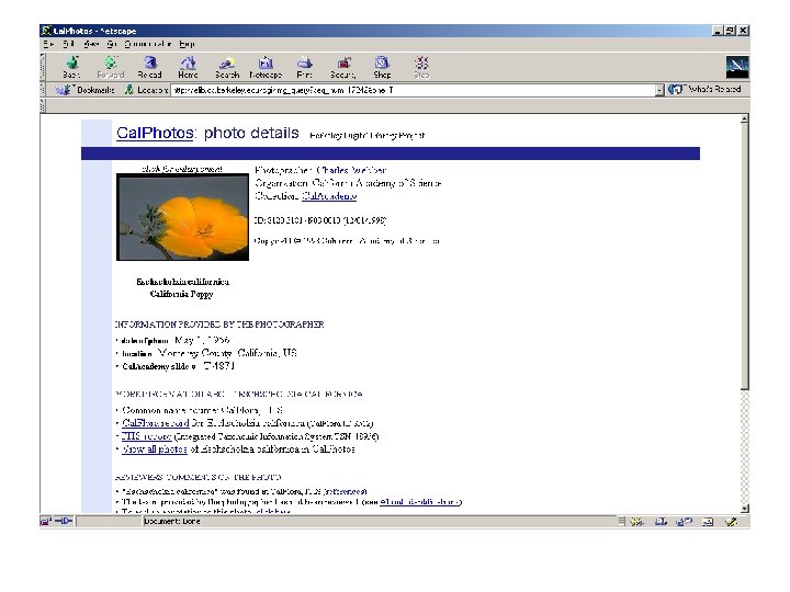 Cal. Photos § In conjunction with the UC Berkeley Digital Library Project http: //elib. cs. berkeley. edu § > 28, 000 images of California plants § Approx. half of all Calif. species are represented § Sources § Some institutions – e. g. Cal Academy of Sciences § Many from “native plant enthusiasts” § Currently accepting/soliciting contributions from users § Major reported uses § Plant identification § Illustrations