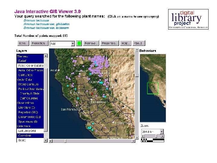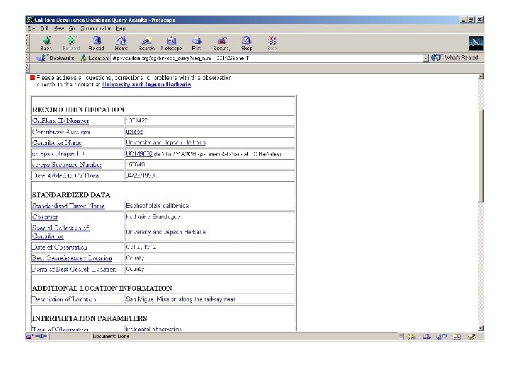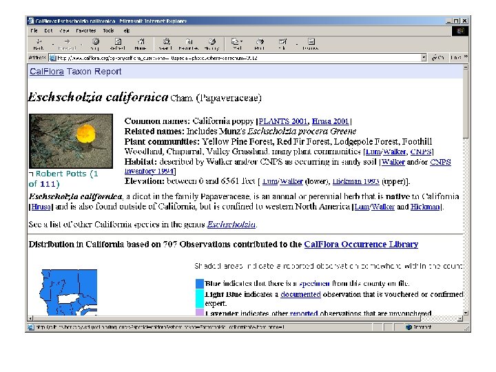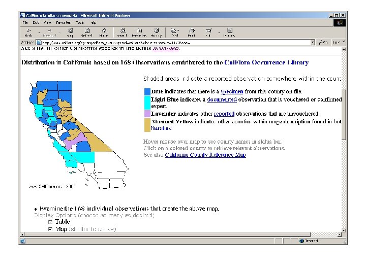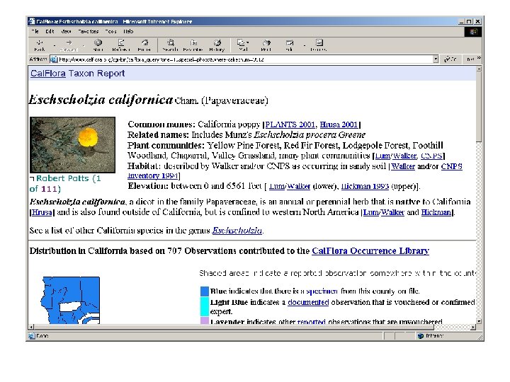 Cal. Flora Occurrence Database § > 800, 000 geo-referenced reports of observations § Specimens in collections § Reports from literature § Reports from field § Checklists § Sources § 19 institutions § About to begin accepting reports from registered contributors via Internet