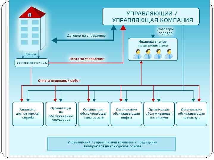 В ТСЖ дешевле Стоимость оплаты за электроэнергию (в муниципальном доме оплата производится исходя из показаний счетчика в конкретной квартире, в то время как ТСЖ оплачивают электроэнергию, применяя установленные соц. нормы на человека Оплата воды (в мун. доме – по тарифам, ТСЖ – по данным водомерного узла) Обслуживание мусоропровода или вывоз бытовых отходов. Оплата таких услуг в ТСЖ значительно ниже, поскольку тип управления домом ТСЖ предполагает возможность заключения договора и поиск компании, предлагающей наиболее выгодные условия. Текущий и капитальный ремонт. В данном вопросе однозначный перевес в сторону ТСЖ, поскольку ТСЖ самостоятельно определяет размер ежемесячных отчислений на ремонтный фонд. (Они зависят от возможностей жильцовсостояния дома). В мун. доме сумма отчислений настолько мала, что капитальный ремонт можно ждать десятилетиями…