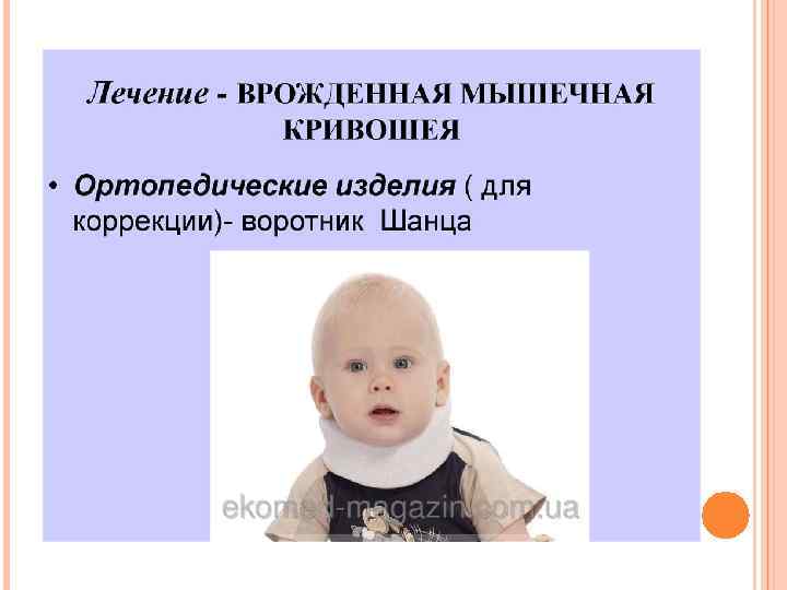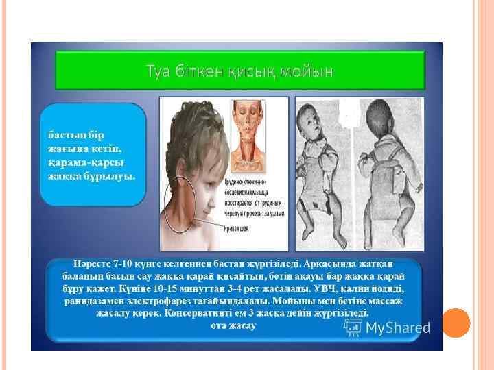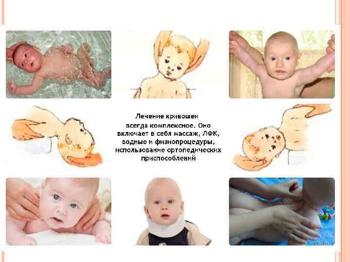 ЕМДЕУ. консервативті. Оның негізінде күніне 3 -4 рет 5 -10 минуттан жүретін түзету дене жаттығуларын жасайды. Бұл жағдайда арқасымен жатқан баланың басын екі қолымен құлаштап, оған дұрыс бағыт береді, яғни зақымданған бұлшықеттен кері бағытқа бұрады. Төс-бұғана-емізікше бұлшықетінің сау жағындағы бұлшықетке массаж жасау керек, зақымданған жағының маңдайына, қабақтарына, бетіне ұдайы массаж жасау, физиотерапиялық ем жүргізу қажет. Массаж жасау зақымдалған бет бұлшықеттеріне, сүйектерге қанайналым, жүйкеленуіне әсер етіп, олардың жетіліп дамуына үлкен көмек береді. Зақымданған бұлшықеттің тыртықтануынан сақтау үшін 6 -8 апталық сәбилерге йодты калиймен ионогальванизация курсын жүргізеді, бұл курсты 3 -4 айдан кейін қайталуға болады. Осы кезеңде зақымданған жақтағы бет пен мойын жағындағы бұлшықеттерді уқалуға көп көңіл бөлген жөн.