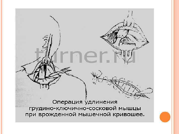 ОПЕРАТИВТІ ЕМІ Туа біткен бұлшықетті қисық мойынды уақытында болмай кеш анықталса операцияны баланың жасы 3 пен 4 тің арасында жасаған жөн. Операция бұлшықет қисықтығы жай еммен консервативті емделмеген кезде яғни жазылмаған жағдайданемесе бет сүйегі мен бас сүйегінің теңсіздігі түзелмеген кезінде жасалады.