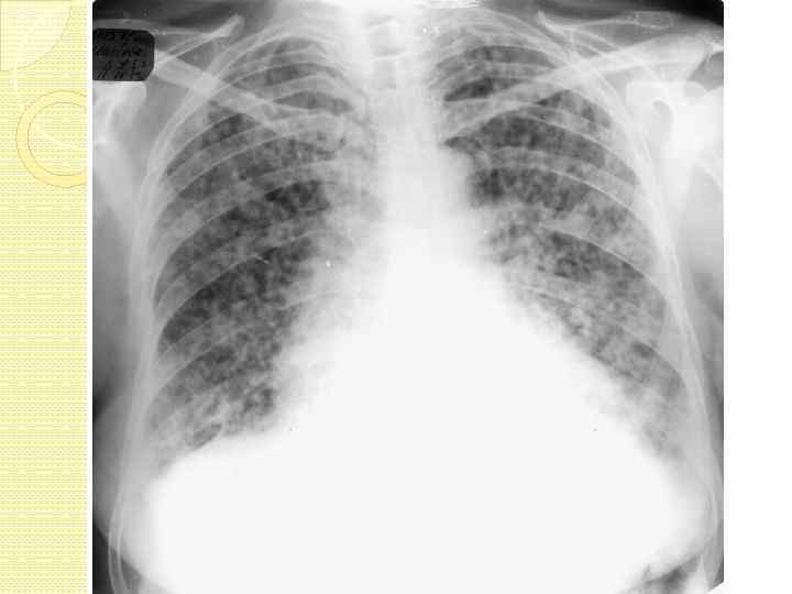 Диссеминированный туберкулез Формы ДТЛ: Милиарный (множественные мелкие – до 2 мм, однотипные очаги на всем протяжении легких, очаги округлой формы, не сливаются, с нечеткими контурами, часто цепочками вдоль сосудов), Подострый (множественные очаги 5 -10 мм, однотипные в верхних и средних отделах, субплевральное расположение, очаги округлой формы, склонны к слиянию, затем ппоявляются полости распада – «штампованные каверны» , симптом «снежной бури» ), Хронический (полиморфная картина – свежие и старые очаги на фоне пневмофиброза, сливаются, могут быть каверны).