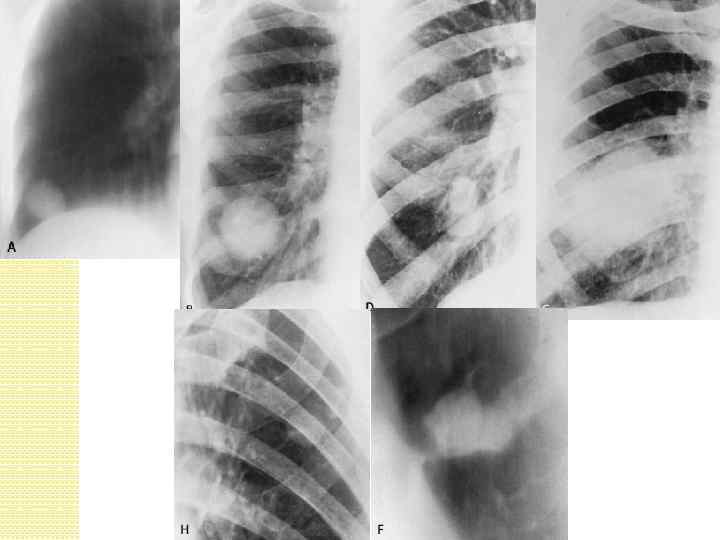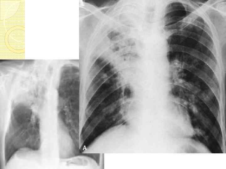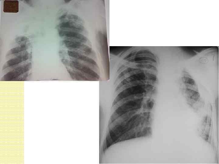Казеозная пневмония Существует 2 клинические формы: Лобарная - самостоятельное заболевание, Rn- затемнение всей доли или большей ее части, сначала однородное, затем с участками просветлений, полостей распада, каверн. Лобулярная – как осложнение. Rnкрупные очаговые тени и фокусы ~1, 5 см в диаметре, неправильной формы, средней и высокой интенсивности с нечеткими контурами.