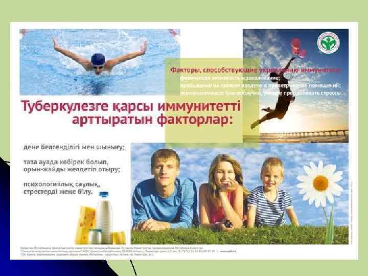 Қорытынды Организмнің жалпы реактивтілігінің көтеріліп, туберкулез инфекциясын қабылдамау үшін , әлеуметтік алдын алу шараларын жүргізуіміз керек. Өмір сүру жағдайын жақсарту, салауатты өмір сүру, тиімді тамақтану адамның жалпы қорғаныш күйін нығайтып туберкулез қоздырғышын қабылдауды төмендетеді.