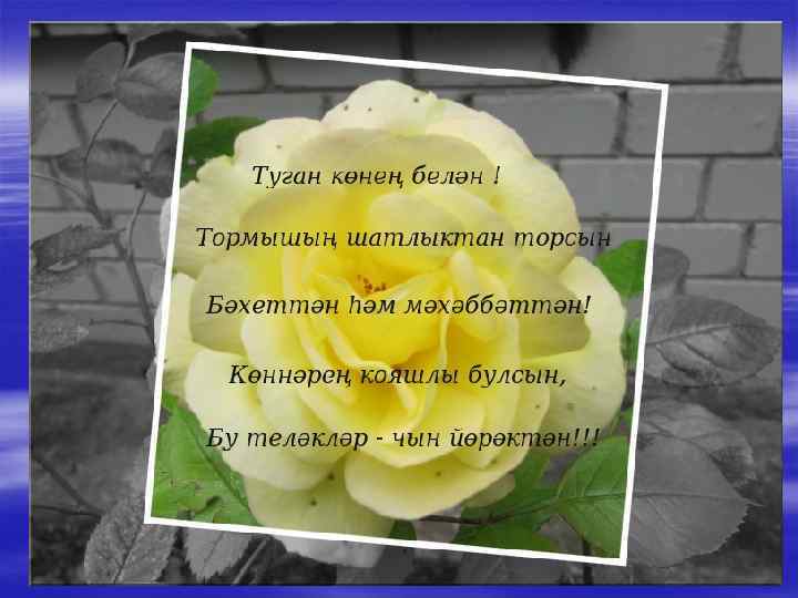 Матур тормыш, сәламәтлек теләп, Туган көнең белән котлыйбыз. Шатлык белән озын гомер үтеп, Яшәвеңне генә телибез. Гомер үтә диеп, моңсуланма, Өмет гөлкәйләрең сүнмәсен. Алтын төсендәге якты көннәр Барыр юлларыңны бизәсен. Туган көнең белән!!!