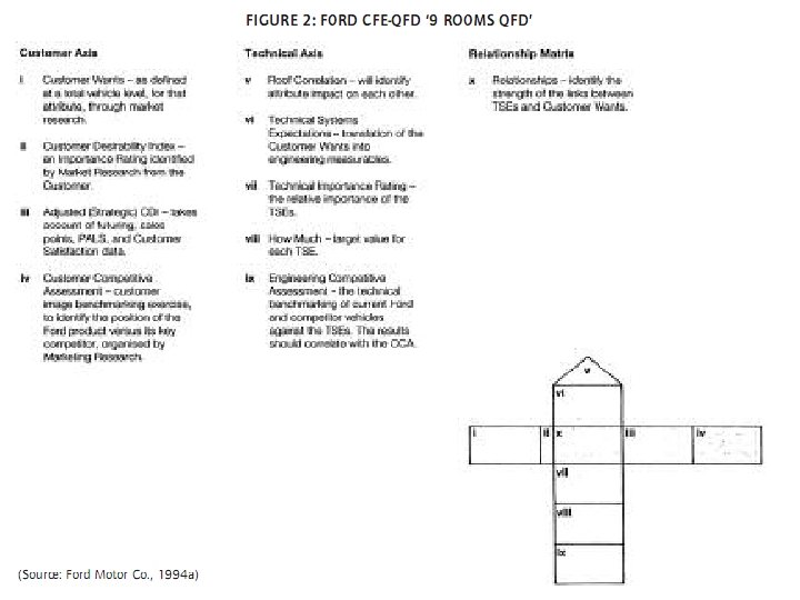 Delapan ruang Clausing, menguraikan secara efektif ruang dasar yang sama Mengarungi Motor menggunakan matrix diagram Rumah. Tabel berkwalitas pada suatu tingkatan perencanaan, menambahkan suatu kesembilan’ ‘ Mutu Rencana’ ruang’, tidak termasuk Matriks Hubungan dimana suatu kunci aspek atau pengarah strategis menyangkut QFD proses di dalam Perusahaan. Suatu contoh menyangkut 9 Format matriks hubungan dan ruang digunakan didalamnya untuk Mengarungi ‘ CFE -QFD’ Tahap 1 HOQ see Fig. 2