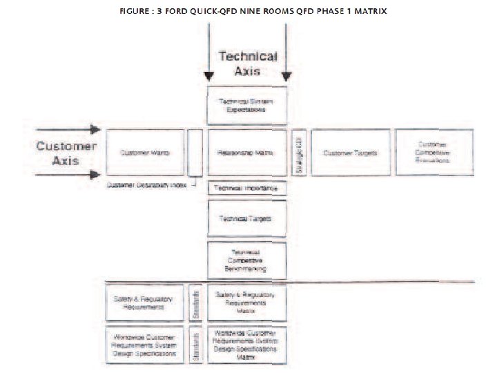 Buah ara. 3 Menunjukkan perbedaan yang sulit dipisahkan bahwa suatu ‘ Quick-Qfd’ Tahap 1 Barang yang dipamerkan selain menggunakan matriks, juga dengan 9 ruang dan suatu Matriks hubungan, lebih lanjut 4 ruang dan 2 Hubungan matriks meliputi keselamatan dan pengatur kebutuhan seperti halnya Arungan Di seluruh dunia Disain sistim dan Kebutuhan Pelanggan Spesifikasi.