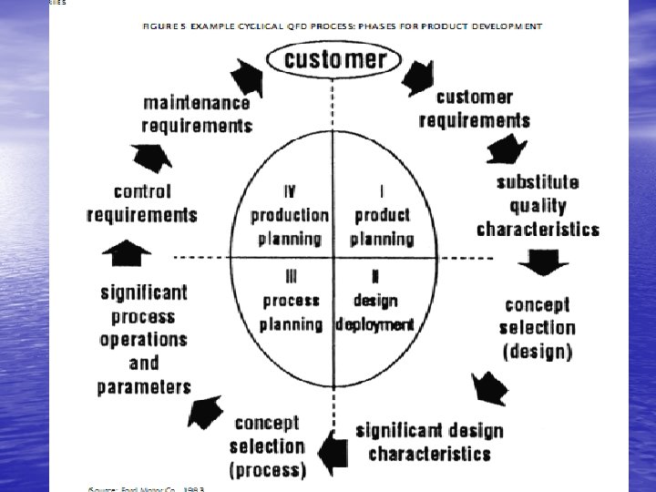 Empat Tahap QFD proses dapat dilihat di cyclical way ( see Fig. ). Memproses waktu ketikadigunakan oleh Perusahaan Motor Arungan ( Fig 6) Tahap pada cascading ke tahap QFD dapat dilihat melalui Fig. 7 ( Hauser, dan Klausing) untuk typical 4 Tahap QFD proses dan Fig. 8 untuk Ford 5 Tahap QFD memproses yang menggunakan Rear View Mirror.