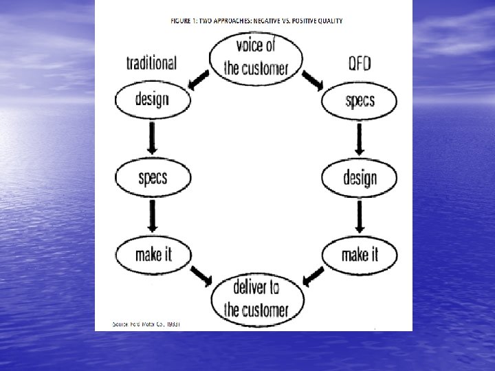 MENYEBARKAN SUARA PELANGGAN MELALUI QFD mechanism to deploy customer desires vertically and horizontally throughout the company Pada suatu pokok tingkatan proses mutu QFD dapat juga dilihat sebagai ‘ hal positif’ peningkatan berkwalitas untuk menghilangkan hal negatif’ mutu pendekatan peningkatan untuk menjadikan kepuasan pelanggan.