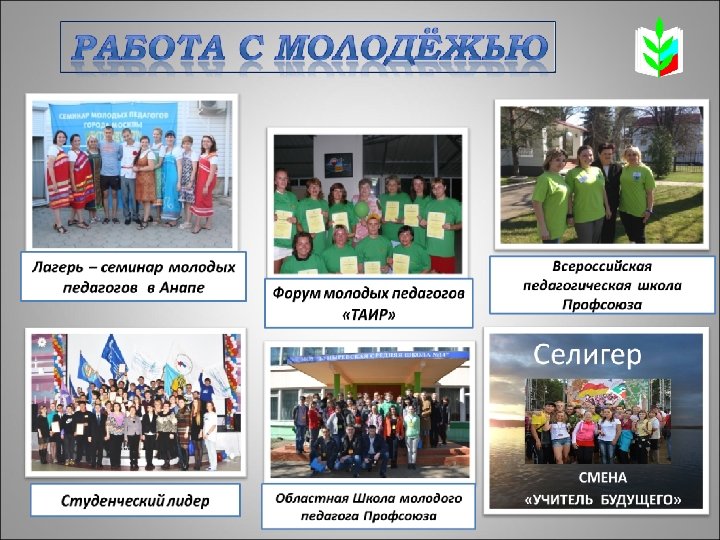 Социальное партнёрство в учреждениях профессионального образования Тул. ГУ, ТГПУ им. Л. Н. Толстого, НИ РХТУ им. Менделеева – действуют коллективные договоры. На работников ТФ ВЗФЭУ распространяется к/д головного университета. Положения об оплате труда приняты по согласованию с профсоюзными организациями. В Тул. ГУ, ТГПУ им Л. Н. Толстого, НИ РХТУ заключены соглашения между ректорами и профсоюзными организациями обучающихся. На совете вопросы: ректоров рассматривались - о мерах социальной поддержки работников вузов, - профсоюзный контроль по защите прав членов Профсоюза - на здоровые и безопасные условия труда, инновационные формы работы отраслевого Профсоюза и др. Гарантии студентам • Льготный проезд студентов на автомобильном, железнодорожном транспорте. • Бесплатное пользование услугами библиотек, бесплатное посещение музеев. • Поощрение победителей и призёров Всероссийских, региональных, межрегиональных конкурсов. • Оздоровление (4373 чел. ) - профилактории, - пансионаты отдыха, - спортивно-оздоровительные лагеря.