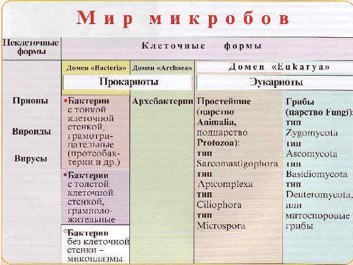 Микроорганизмы представлены доклеточными формами (вирусы — царство Vira) и клеточными формами (бактерии, архебактерии, грибы и простейшие). По новому высшему уровню в иерархии классификации среди клеточных форм жизни различают 3 домена (или «империи» ): «Bacteria» , «Archaea» , «Eukarya»