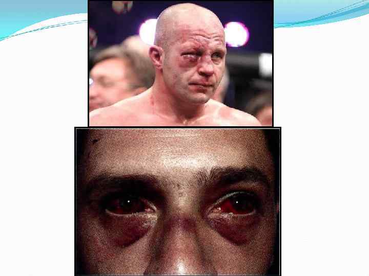 Повреждений придаточного аппарата: 1) ВЕКИ: Ссадины гематома отек эмфизема птоз разрывы, отрывы век 2) ПОВРЕЖДЕНИЕ СЛЕЗНЫХ ОРГАНОВ 3) ИЗМЕНЕНИЕ КОНЪЮНКТИВЫ 4) ПОВРЕЖДЕНИЕ ОРБИТЫ