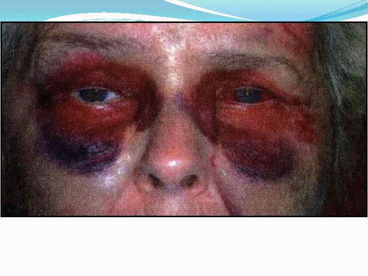 Косвенные: • Отек с кровоизлияниями мягких тканей окологлазничной области и век • Хемоз конъюнктивы • Симптом очков • Нарушение слезоотведения • Птоз • Резкое снижение остроты зрения или слепота при прозрачных оптических средах • Косоглазие • Расстройство кожной чувствительности в зоне иннервации тройничного нерва.