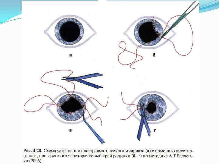 Повреждение радужки: • Реактивный миоз – вызванный раздражением сфинктера зрачка (ложная миопия проходит через 2 3 дня) • Мидриаз - зрачок расширен, неправильной формы. Сопровождается единичными или множественными надрывами края зрачка.