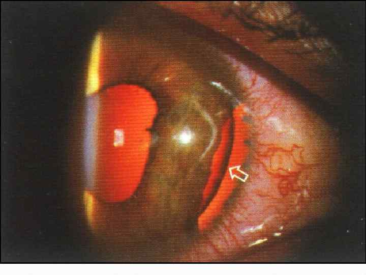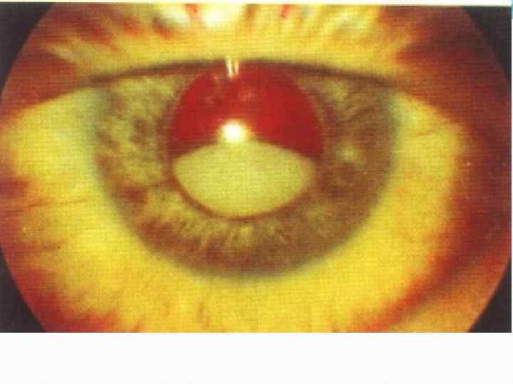 Гифема o В первые часы после травмы кровь в передней камере находится во взвешенном состоянии. Через несколько часов после травмы кровь оседает на дно передней камеры с ровным горизонтальным уровнем. o Причиной образования гифемы является разрыв ткани в углу передней камеры (склеральная шпора) ввиде мазков на радужке или полоски на дне ПК (рассасывается самостоятельно) o При тотальной гифеме (снижает ОЗ) o Повторные кровоизлияния возможны в основном на 2 5 день (провоцируются местным применением тепла, мидриатиками) o Возможен подъем ВГД
