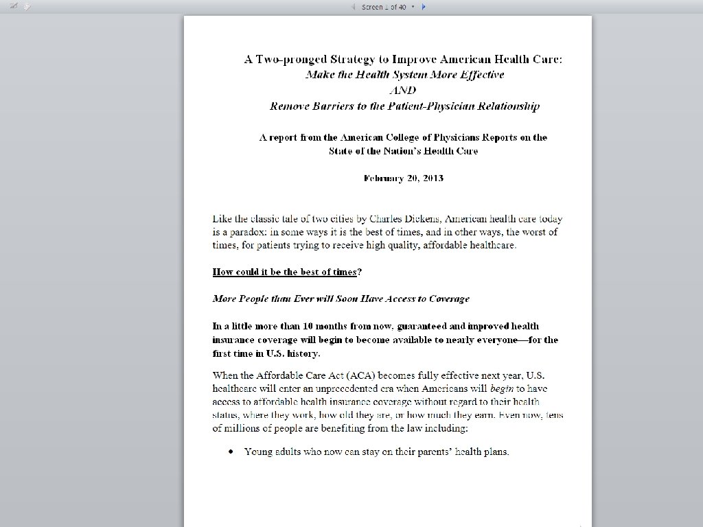 The destination “A nationwide program is needed to assure access to h care for all Americans, and we recommend that develo such a program be adopted as a policy goal for the nat The College believes that health insurance coverage fo persons is needed to minimize financial barriers and a access to appropriate health care services. ” Ginsburg, et al, American College of Physicians, Position Paper, Annals of Internal Medicine, May 1, 1990 www. annals. org/search? fulltext=ACP+universal+health+insurance&submit=yes&x=15&y=9