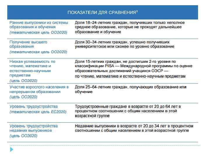 СРЕДНЕСРОЧНЫЕ РЕЗУЛЬТАТЫ Содействовать обучению на рабочем месте во всех его формах, уделяя особое внимание производственной практике, путем вовлечения социальных партнеров, компаний, торговопромышленных палат и учреждений ПОО, а также с помощью стимулирования инноваций и предпринимательства Продолжить разработку механизмов обеспечения качества ПОО в соответствии с рекомендациями EQAVET и создать, как элемент системы обеспечения качества, непрерывные каналы для обмена информацией и обратной связи в системах I-VET и C-VET на основе результатов обучения Улучшить доступ к ПОО и квалификациям для всех с помощью более гибких и доступных систем, в частности путем оказания эффективных и интегрированных услуг профессиональной ориентации и обеспечения доступности сертификации неофициального и неформального обучения