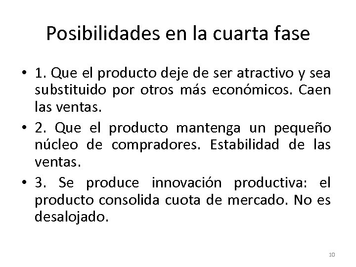 Posibilidades en la cuarta fase • 1. Que el producto deje de ser atractivo y sea substituido por otros más económicos. Caen las ventas. • 2. Que el producto mantenga un pequeño núcleo de compradores. Estabilidad de las ventas. • 3. Se produce innovación productiva: el producto consolida cuota de mercado. No es desalojado. 10